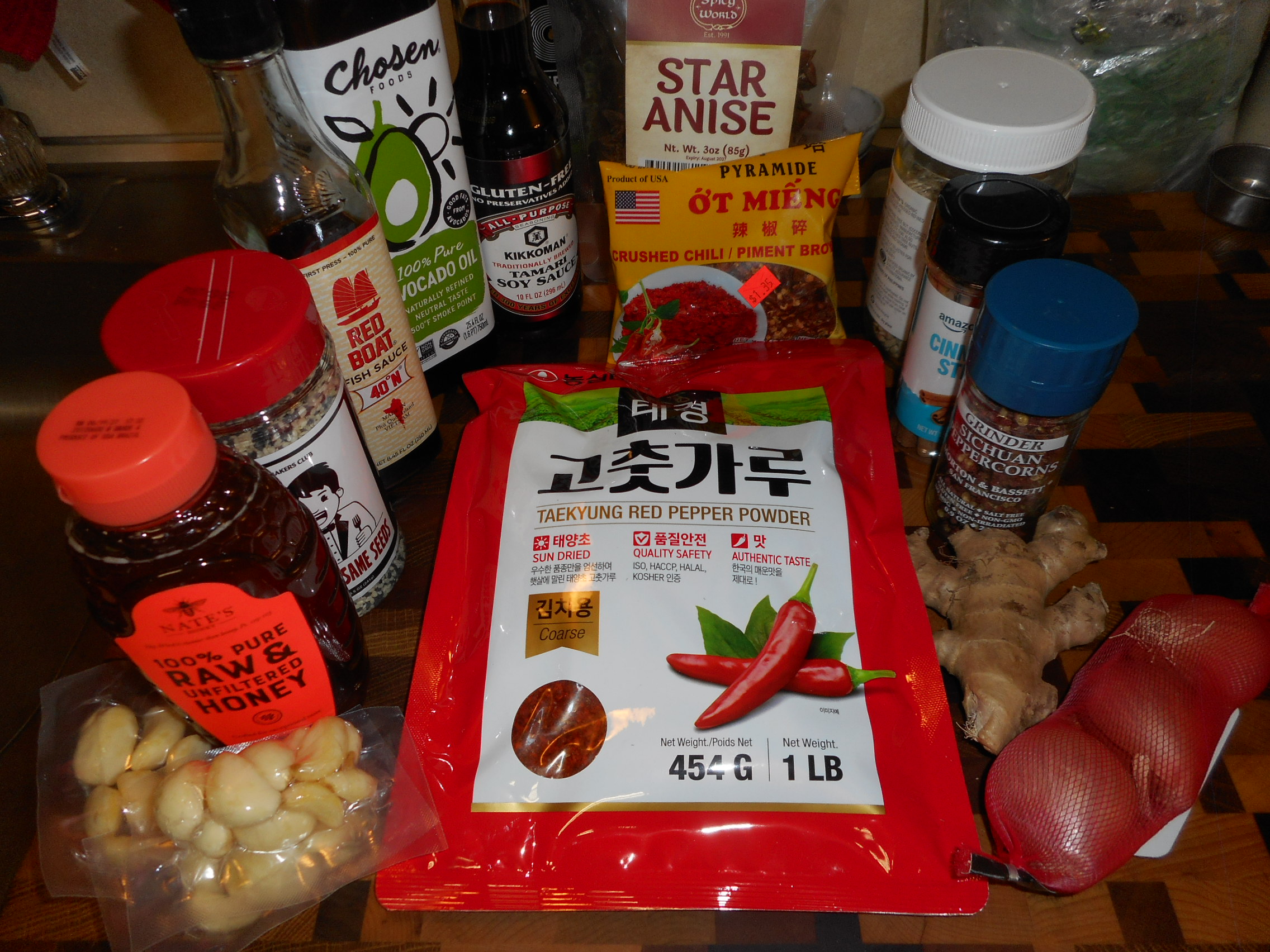 6. Add 5 Whole Star Anise, 2 Cinnamon Sticks 2-4 Minutes. Now Strain oil & discard bulky stuff, by pouring over a medium bowl of ⅔ C Coarsely Ground Korean Chili Flakes, stir, infusing oil with the chilis. Strain & discard chili flakes, you have now totally infused your oil.